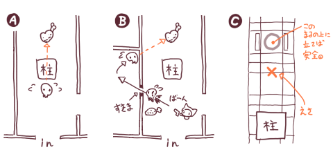 図Aのように柱を挟んだ反対側にエサを置くことで柱に引っ掛けるとスムーズですが、